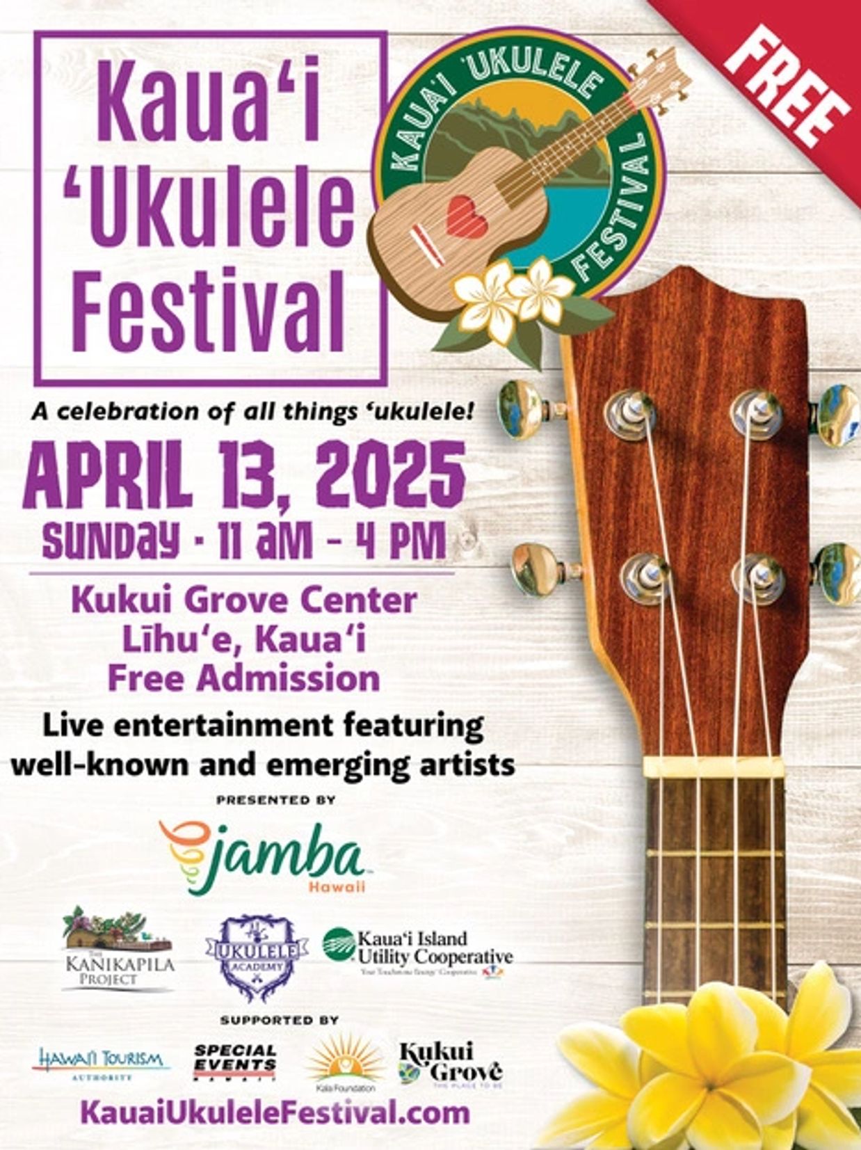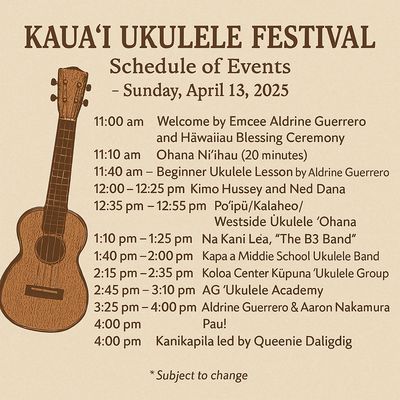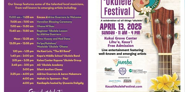 Aldrine Guerrero & Aaron Nakamura, Kimo Hussey and Ned Dana, Kapaʻa Middle School ʻUkulele Band, Poʻipū/Kalaheo/Westside ʻUkulele ʻOhana, AG ʻUkulele Academy, Koloa Center Kūpuna ‘Ukulele Group, Na Kani Le'a, “The B3 Band”, and more! Bring your ʻukulele and participate in the Kanikapila following the event at 4 pm lead by Queenie Daligdig.