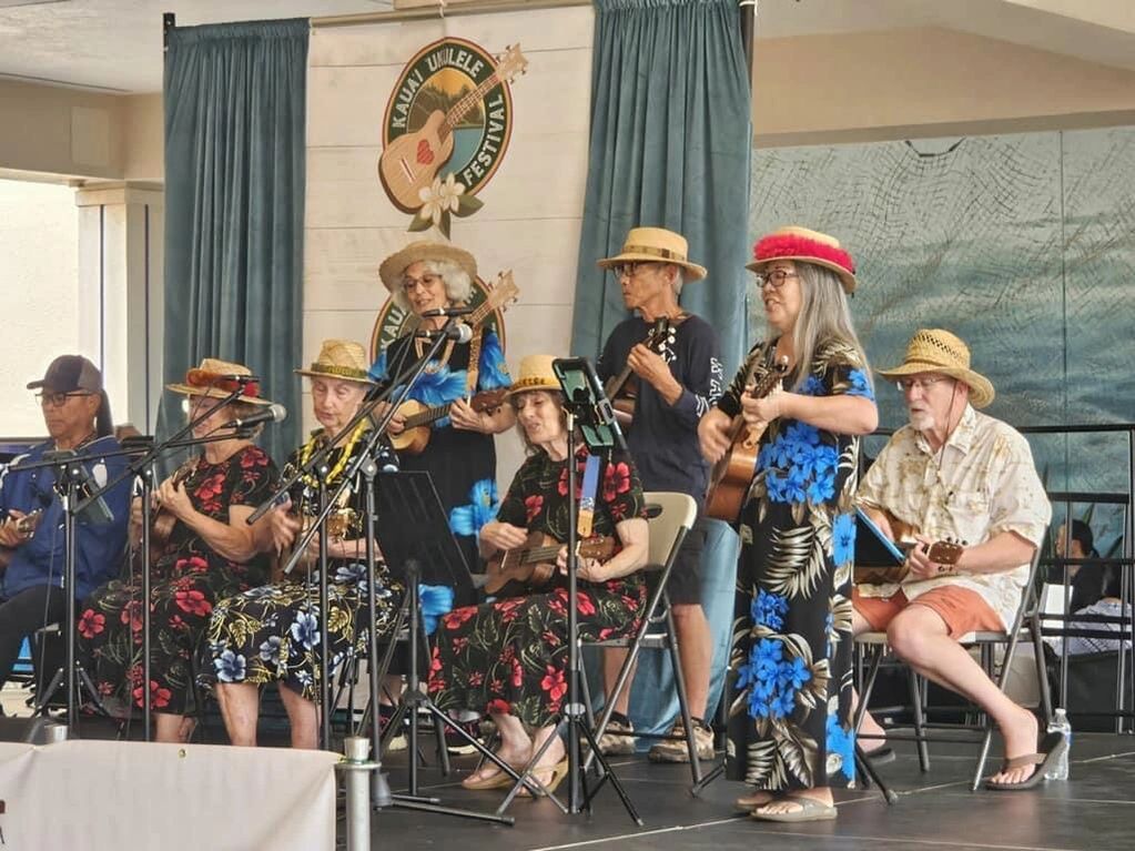 A fusion of itinerant ukulele players from Po'ipu, the Kalaheo Pavilion, the Kalaheo Community Center Seniors, and the West side who come together in many different forms, and particularly the Ukulele Festival, to always make music and have fun.